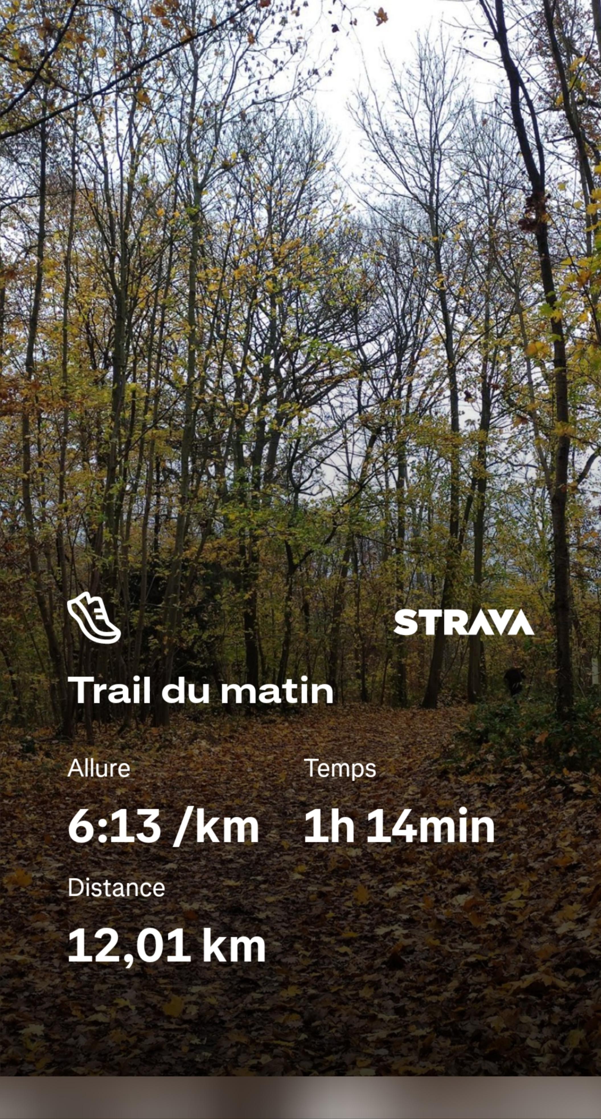 allure moyenne 6’13/km sur terrain vallonné (+70 m D+). Bon mardi à tous !