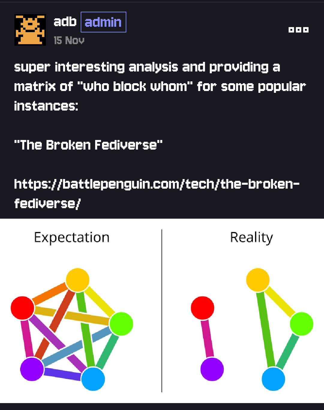 Still, spot on definition of the fedi. Which is also pretty much both is strength and weakness. You don't need to REACH the world, you just need to find your people. For mass advertising messages go to commercial social media and pester them there with random angry people, for a sense of worldwide close-knit neighbourhood where people matter, and you know each one by name: stay.