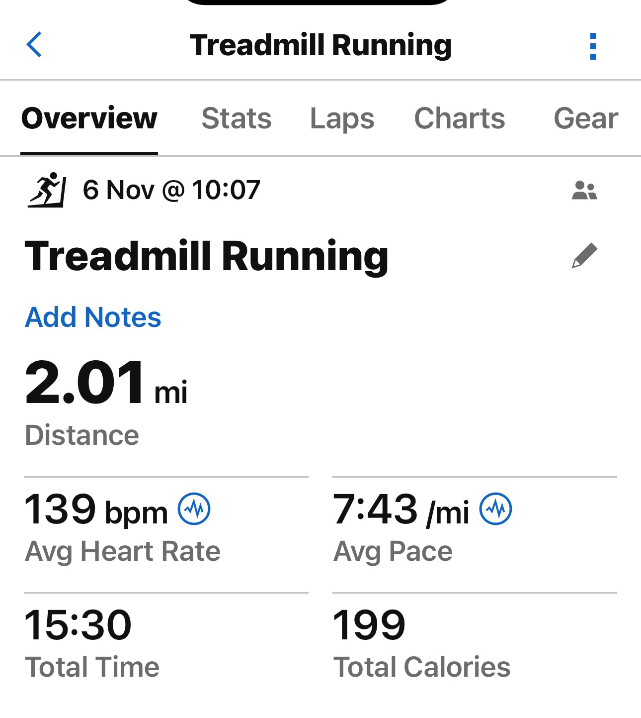 Run: Distance: 7.7km, Elevation Gain: 34m, Moving Time: 00:43:14, Pace: 5:35/km, Estimated Avg Power: 214.4 (from power meter), Weighted Avg Power: 216
